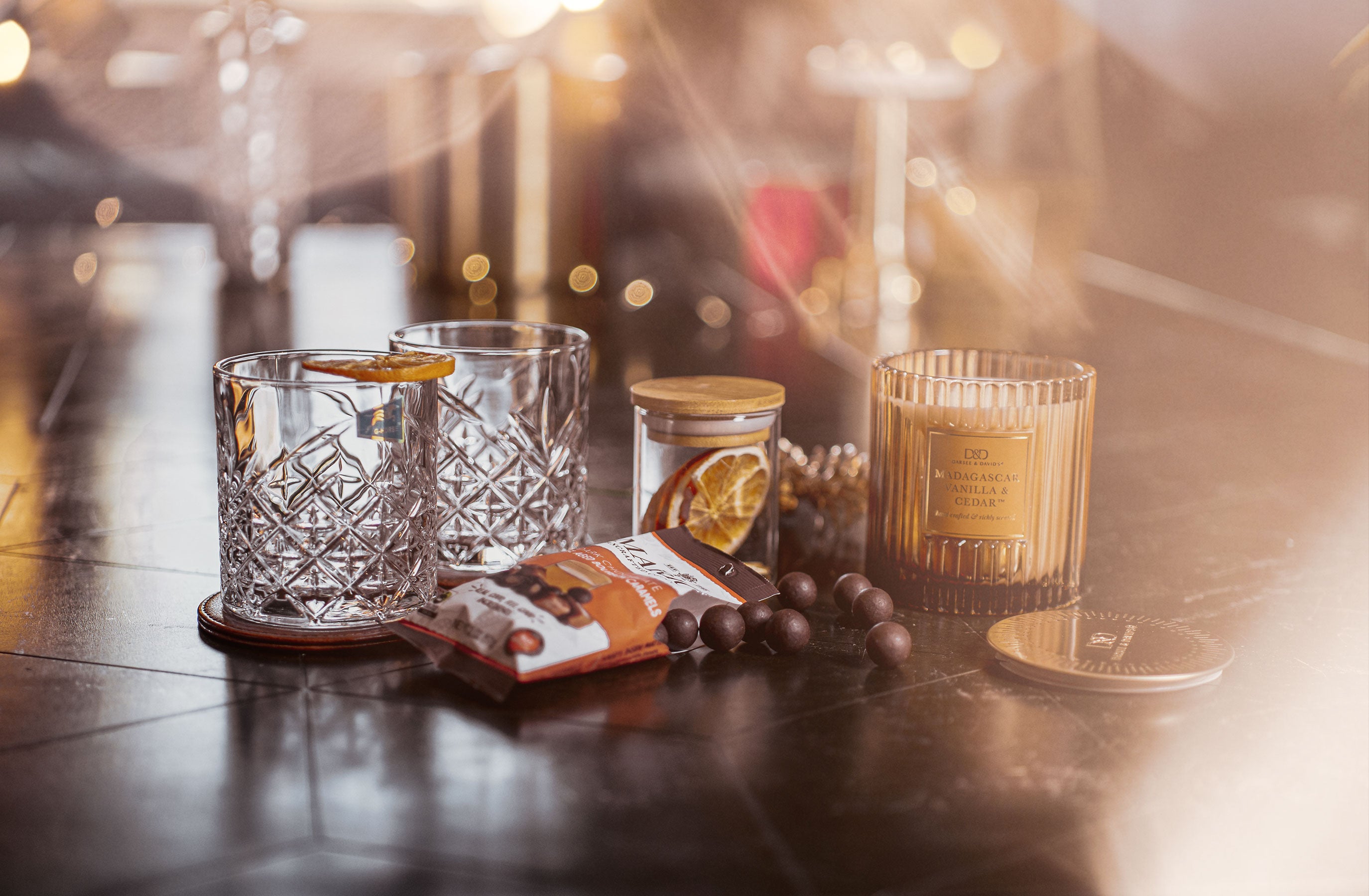 Celebrate in style with this golden gift box that’s bursting with goodies! Enjoy bourbon caramels coated in chocolate for a delicious treat, plus two sleek cocktail glasses with leather coasters that’ll make any sip feel special. Add in a handful of sweet mixed nuts, and you’ve got the perfect combo for a fun, flavorful gift that’s sure to delight.
